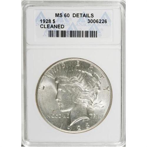 <B>1928 $1 --Cleaned--ANACS. MS60 Details.</B></I> NGC Census: (53/3018). PCGS Population (76/4638). Mintage: 360,649. Numismedia Wsl. Price for NGC/PCGS coin in MS60: $460. (#7373)<BR><BR><B>Coin Engraver:</B> Anthony de Francisci<BR><BR><b>Shipping:</b> Coins & Currency (<a target="_blank" href="http://www.heritageauctions.com/common/shipping.php">view shipping information</a>)