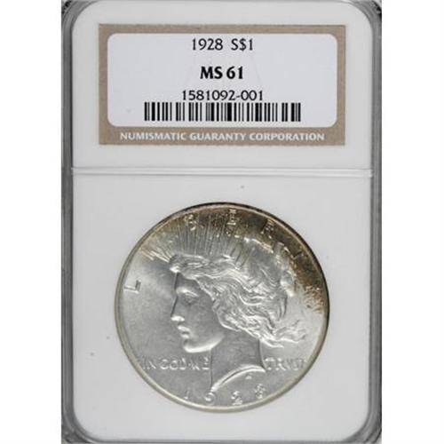 <B>1928 $1 MS61 NGC.</B></I> NGC Census: (275/2759). PCGS Population (221/4431). Mintage: 360,649. Numismedia Wsl. Price for NGC/PCGS coin in MS61: $475. (#7373)<BR><BR><B>Coin Engraver:</B> Anthony de Francisci<BR><BR><b>Shipping:</b> Coins & Currency (<a target="_blank" href="http://www.heritageauctions.com/common/shipping.php">view shipping information</a>)