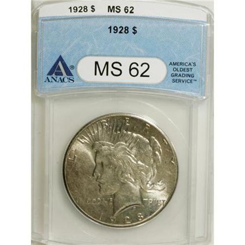 <B>1928 $1 MS62 ANACS.</B></I> NGC Census: (802/1927). PCGS Population (1061/3202). Mintage: 360,649. Numismedia Wsl. Price for NGC/PCGS coin in MS62: $492. (#7373)<BR><BR><b>Shipping:</b> Coins & Currency (<a target="_blank" href="http://www.heritageauctions.com/common/shipping.php">view shipping information</a>)