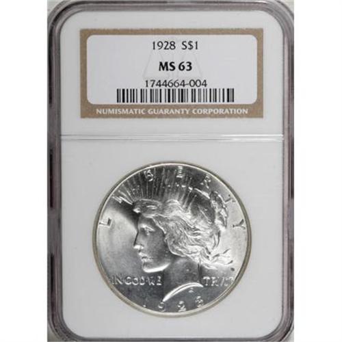 <B>1928 $1 MS63 NGC.</B></I> Flashy and minimally toned, a lovely Select example of this popular low-mintage Peace issue. Though both sides show a few light abrasions, the overall eye appeal is suggestive of an even finer grade.<BR><BR><B>Coin Engraver:</B> Anthony de Francisci<BR><BR><b>Shipping:</b> Coins & Currency (<a target="_blank" href="http://www.heritageauctions.com/common/shipping.php">view shipping information</a>)
