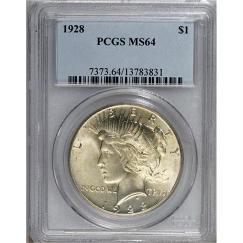 <B>1928 $1 MS64 PCGS.</B></I> A solidly struck example of this prominent Philadelphia key that exhibits vibrant luster and a touch of golden patina. A handful of wispy abrasions in the fields and on the neck are the only obstacles to an even finer grade.<BR><BR><B>Coin Engraver:</B> Anthony de Francisci<BR><BR><b>Shipping:</b> Coins & Currency (<a target="_blank" href="http://www.heritageauctions.com/common/shipping.php">view shipping information</a>)