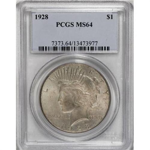 <B>1928 $1 MS64 PCGS.</B></I> A splendid specimen with sharp design features and frosty silver luster beneath light gray color that is accented by hints of gold and iridescence.<BR><BR><B>Coin Engraver:</B> Anthony de Francisci<BR><BR><b>Shipping:</b> Coins & Currency (<a target="_blank" href="http://www.heritageauctions.com/common/shipping.php">view shipping information</a>)