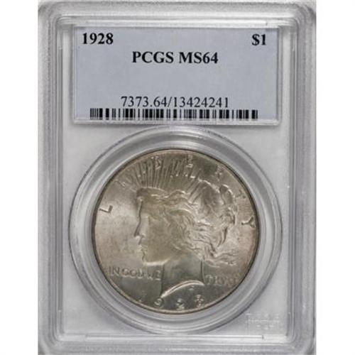<B>1928 $1 MS64 PCGS.</B></I> This attractive dollar is a borderline Gem with frosty luster and ivory surfaces accented by hints of champagne and pale lilac toning. It is unusual to have an opportunity like this, the chance to bid on multiple 1928 Peace dollars, greatly improving the chance to finish a set.<BR><BR><B>Coin Engraver:</B> Anthony de Francisci<BR><BR><b>Shipping:</b> Coins & Currency (<a target="_blank" href="http://www.heritageauctions.com/common/shipping.php">view shipping information</a>)