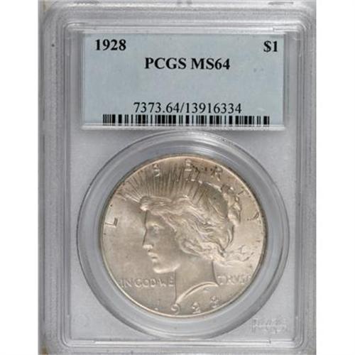 <B>1928 $1 MS64 PCGS.</B></I> A pretty Choice representative of this perennially popular Peace dollar issue, well-defined and softly lustrous with tan and charcoal peripheral toning around silver-gray centers. A handful of small abrasions are present on Liberty's portrait.<BR><BR><B>Coin Engraver:</B> Anthony de Francisci<BR><BR><b>Shipping:</b> Coins & Currency (<a target="_blank" href="http://www.heritageauctions.com/common/shipping.php">view shipping information</a>)