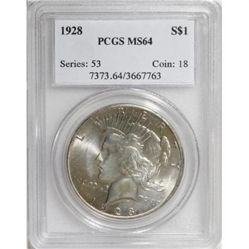 <B>1928 $1 MS64 PCGS.</B></I> A lustrous near-Gem with satiny silver surfaces and subtle champagne toning. A few insignificant marks prevent a Gem grade assessment.<BR><BR><B>Coin Engraver:</B> Anthony de Francisci<BR><BR><b>Shipping:</b> Coins & Currency (<a target="_blank" href="http://www.heritageauctions.com/common/shipping.php">view shipping information</a>)