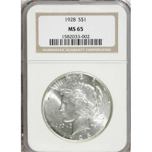 <B>1928 $1 MS65 NGC.</B></I> Sharp design details and full mint brilliance are the features of this Gem that approaches the finest certified quality for the date. The mintage of 360,649 coins is the lowest total production of any regular Peace dollar issue. Census: 78 in 65, 2 finer (12/07).<BR><BR><B>Coin Engraver:</B> Anthony de Francisci<BR><BR><b>Shipping:</b> Coins & Currency (<a target="_blank" href="http://www.heritageauctions.com/common/shipping.php">view shipping information</a>)