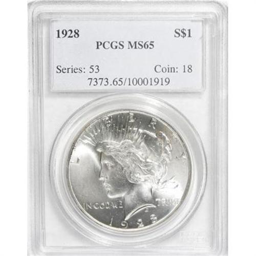 <B>1928 $1 MS65 PCGS.</B></I> The 1928 has the lowest mintage (360,649 pieces) of the Peace dollar series (except for the 1922 High Relief). Dazzling luster adorns essentially untoned surfaces that possess a satiny finish, and a well executed strike imparts sharp definition on the design features. A few minor ticks on the motifs just barely prevent a higher grade. PCGS has seen only 11 pieces finer (5/07).<BR><BR><b>Shipping:</b> Coins & Currency (<a target="_blank" href="http://www.heritageauctions.com/common/shipping.php">view shipping information</a>)