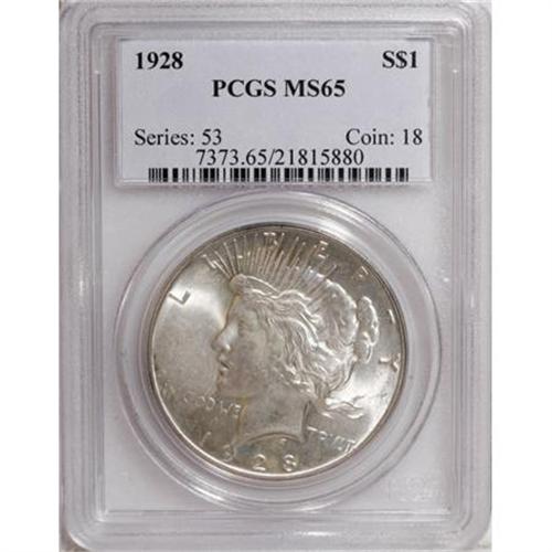 <B>1928 $1 MS65 PCGS.</B></I> The key to the Peace Dollar series in most grades, the 1928 is somewhat available at the Gem level, yet difficult to find nicer. This coin carries a good deal of satin luster along with a subtle olive-gold tint over portions of its bright surfaces. Notable surface abrasions are few in number, and appropriate to the grade.<I><BR>From The Arnold & Harriet Collection.</B></I><BR><BR><B>Coin Engraver:</B> Anthony de Francisci<BR><BR><b>Shipping:</b> Coins & Currency (<a target="_blank" href="http://www.heritageauctions.com/common/shipping.php">view shipping information</a>\)