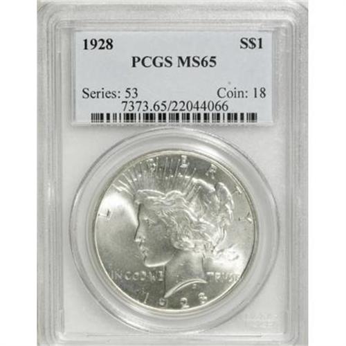 <B>1928 $1 MS65 PCGS.</B></I> Except for the 1922 High Relief, the 1928 has the lowest mintage in the Peace dollar series (360,649 pieces). The current MS65 specimen exhibits sharply struck design features, along with radiantly lustrous, color-free surfaces. A few minuscule marks preclude this dazzling coin from attaining an even higher grade.<BR><I>From The New York Eye Appeal Collection, Part Three.</B></I><BR><BR><B>Coin Engraver:</B> Anthony de Francisci<BR><BR><b>Shipping:</b> Coins & Currency (<a target="_blank" href="http://www.heritageauctions.com/common/shipping.php">view shipping information</a>)