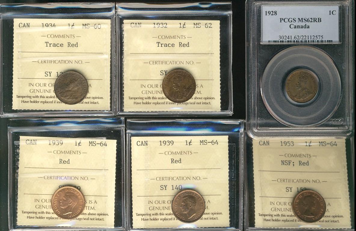 1928 1¢ PCGS MS62RB, 1932 MS62 Trace Red, 1934 MS60 Trace Red, 1939(2), 1953 NSF 1¢ ICCS MS64RD. Lo
