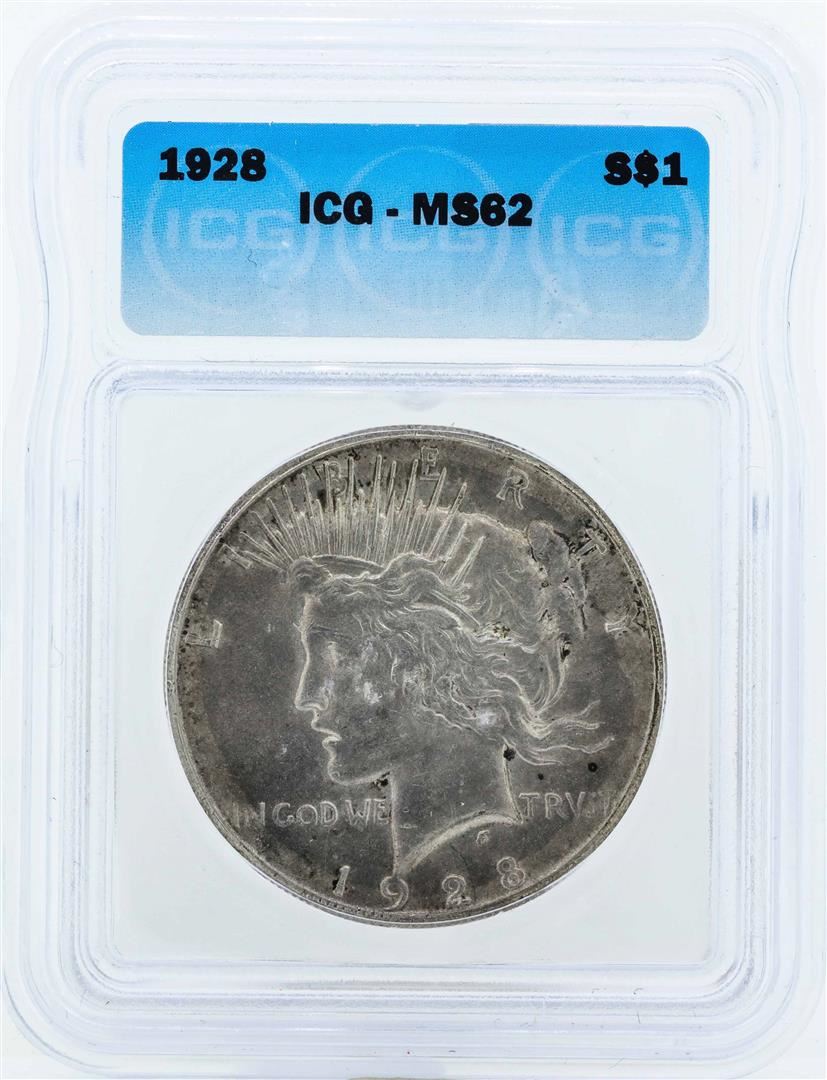 One 1928 $1 Peace Silver Dollar Coin ICG MS62. ICG Certified.