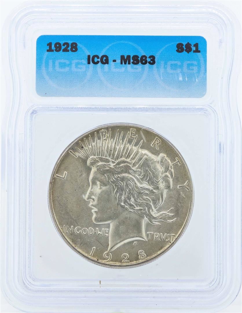 One 1928 $1 Peace Silver Dollar Coin ICG MS63. ICG Certified.