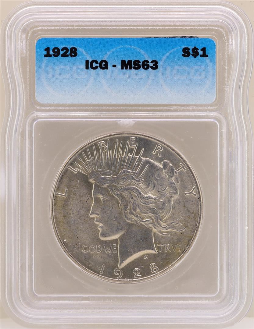 One 1928 $1 Peace Silver Dollar Coin ICG MS63. ICG Appraised.