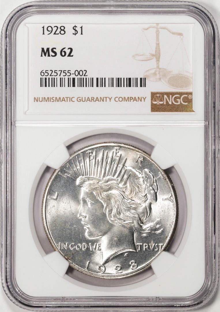 One 1928 $1 Peace Silver Dollar Coin NGC MS62. NGC Certified.