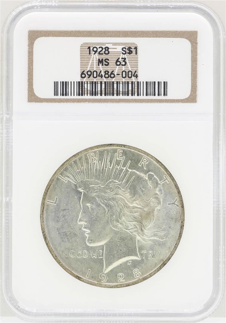 One 1928 $1 Peace Silver Dollar Coin NGC MS63. NGC Certified.