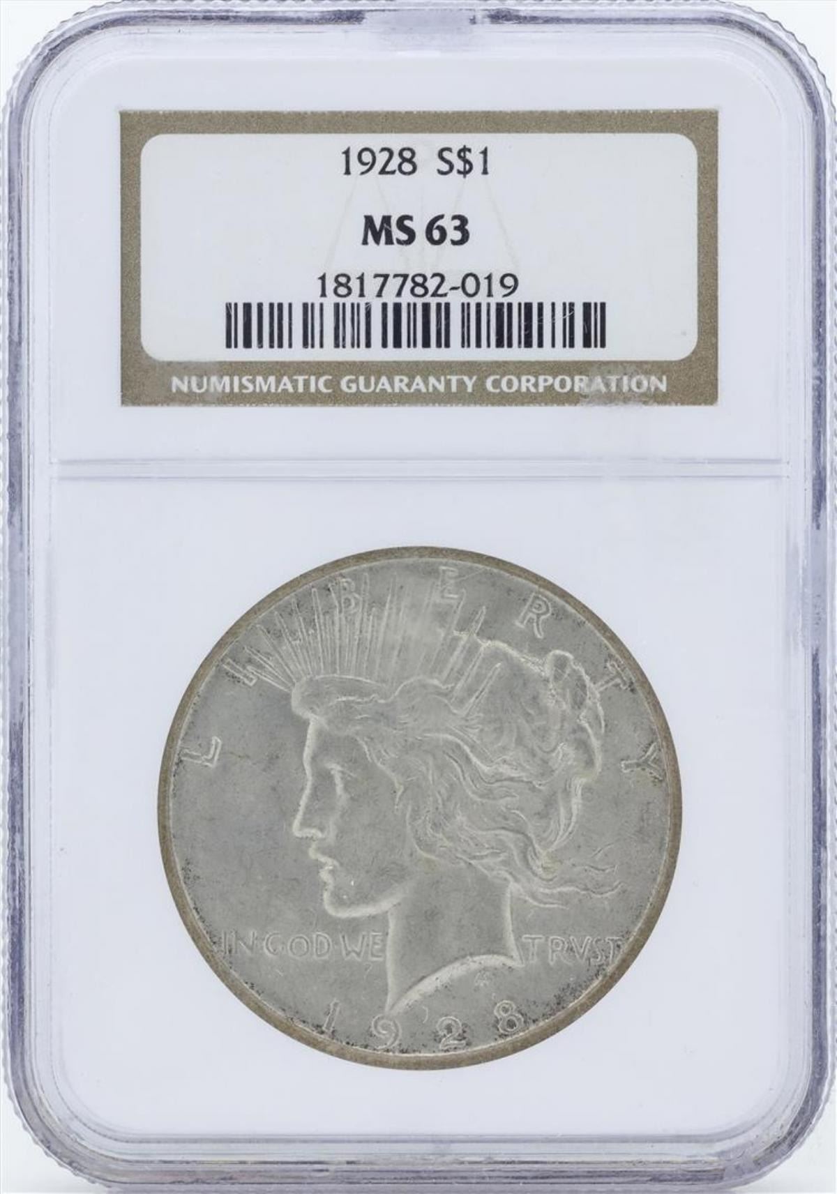 One 1928 $1 Peace Silver Dollar Coin NGC MS63. NGC Certified.