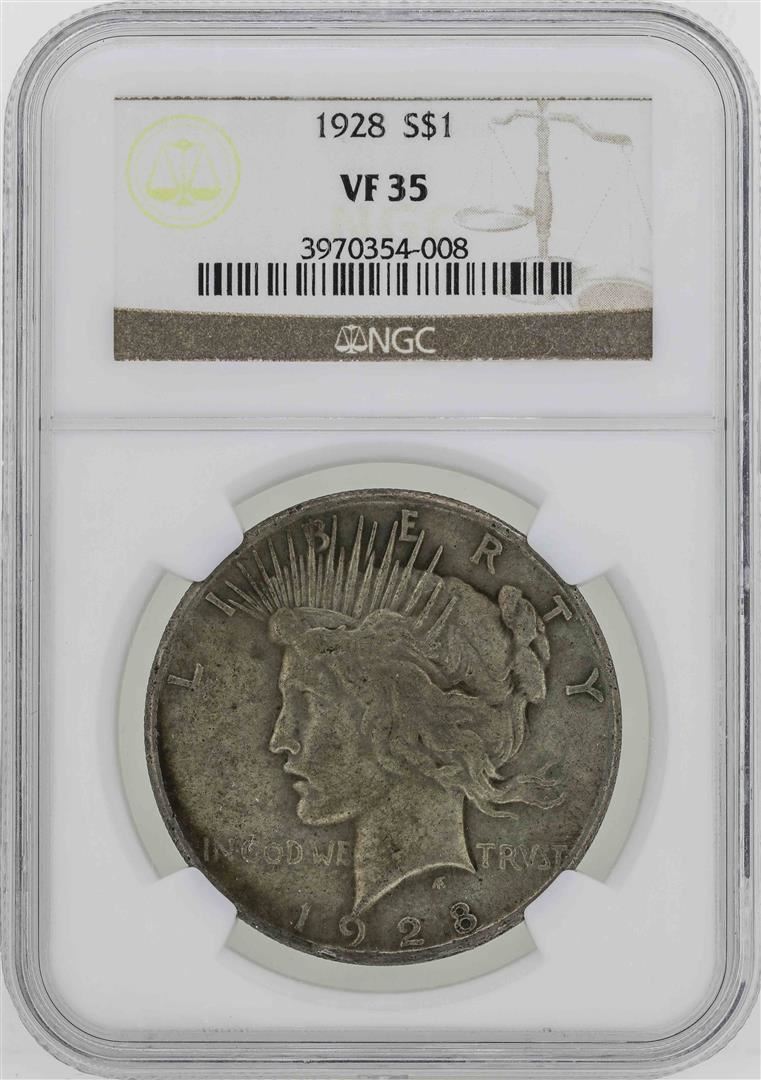 One 1928 $1 Peace Silver Dollar Coin NGC VF35. NGC Certified.