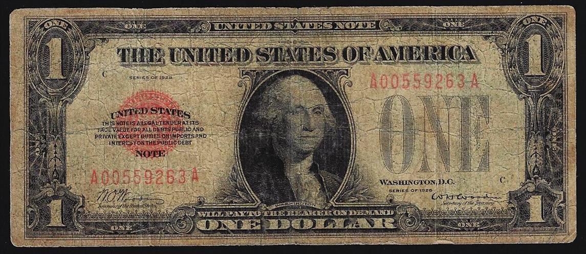 One 1928 $1 Red Seal Legal Tender Note.