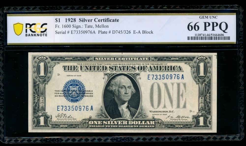 One 1928 $1 Silver Certificate PCGS 66PPQ.
