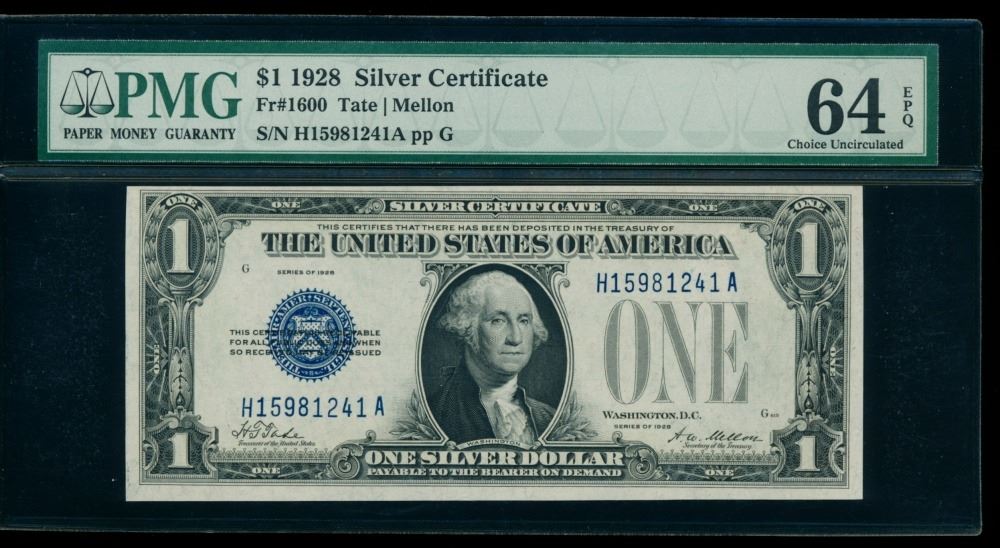 One 1928 $1 Silver Certificate PMG 64EPQ.