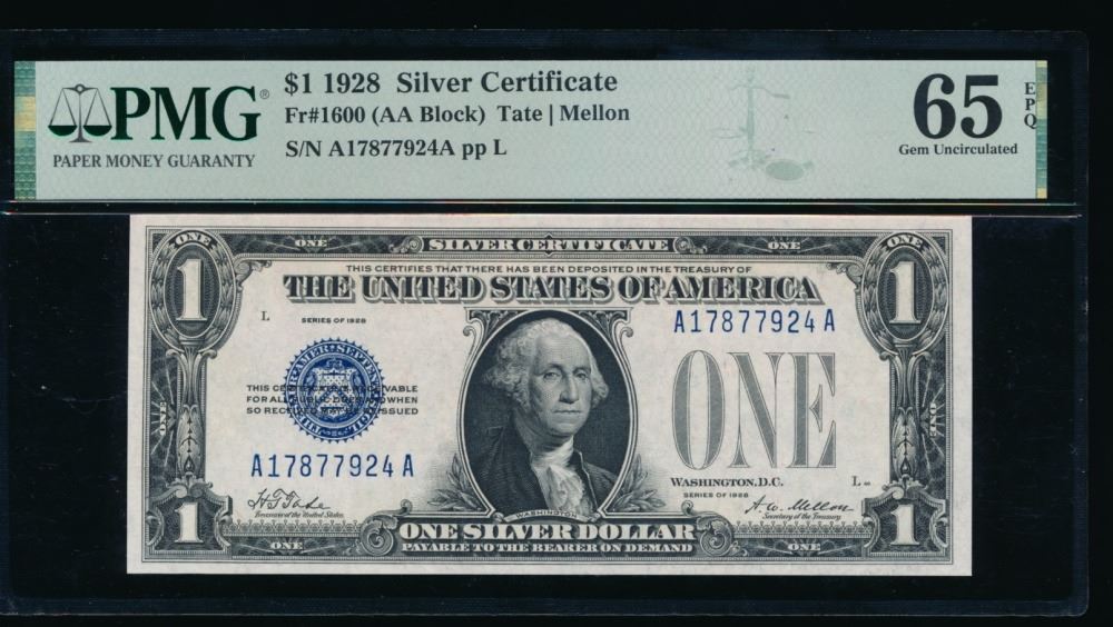 One 1928 $1 Silver Certificate PMG 65EPQ.