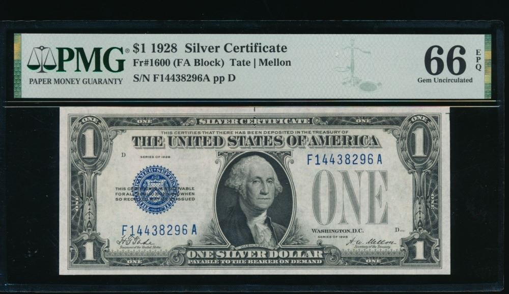 One 1928 $1 Silver Certificate PMG 66EPQ.