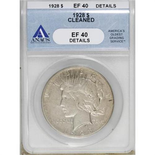 <B>1928 $1 --Cleaned--ANACS XF40 Details.</B></I> NGC Census: (8/3840). PCGS Population (31/5945). Mintage: 360,649. Numismedia Wsl. Price for NGC/PCGS coin in XF40: $383. (#7373)<BR><BR><B>Coin Engraver:</B> Anthony de Francisci<BR><BR><b>Shipping:</b> Coins & Currency (<a target="_blank" href="http://www.heritageauctions.com/common/shipping.php">view shipping information</a>)