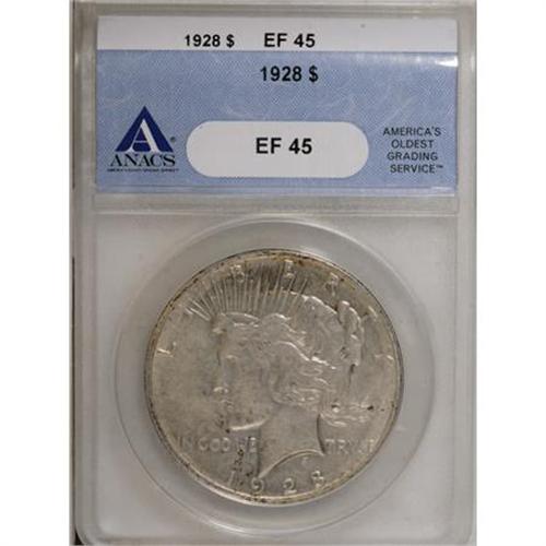 <B>1928 $1 XF45 ANACS.</B></I> . NGC Census: (30/3814). PCGS Population (54/5933). Mintage: 360,649. Numismedia Wsl. Price for NGC/PCGS coin in XF45: $388. (#7373)<BR><BR><B>Coin Engraver:</B> Anthony de Francisci<BR><BR><b>Shipping:</b> Coins & Currency (<a target="_blank" href="http://www.heritageauctions.com/common/shipping.php">view shipping information</a>)
