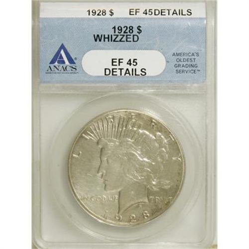 <B>1928 $1 --Whizzed--ANACS. XF45 Details.</B></I> NGC Census: (30/3834). PCGS Population (54/5966). Mintage: 360,649. Numismedia Wsl. Price for NGC/PCGS coin in XF45: $388. (#7373)<BR><BR><B>Coin Engraver:</B> Anthony de Francisci<BR><BR><b>Shipping:</b> Coins & Currency (<a target="_blank" href="http://www.heritageauctions.com/common/shipping.php">view shipping information</a>)
