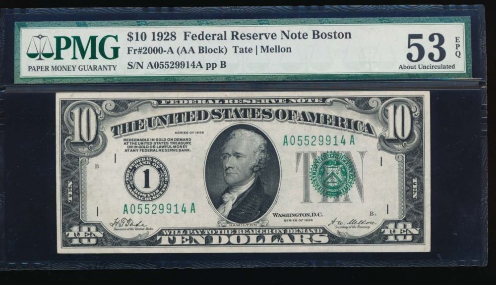 One 1928 $10 Boston Federal Reserve Note PMG 53EPQ.