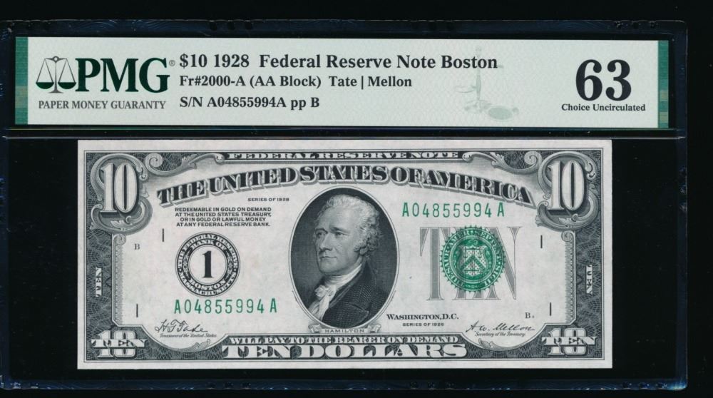 One 1928 $10 Boston Federal Reserve Note PMG 63.