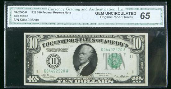 1928, $10 Federal Reserve Note. CGA Gem Uncirculated 65. . Fr-2000-K. A lovely numbered-seal Ten from the Dallas district bank that is notated "Original Paper Quality" by CGA.