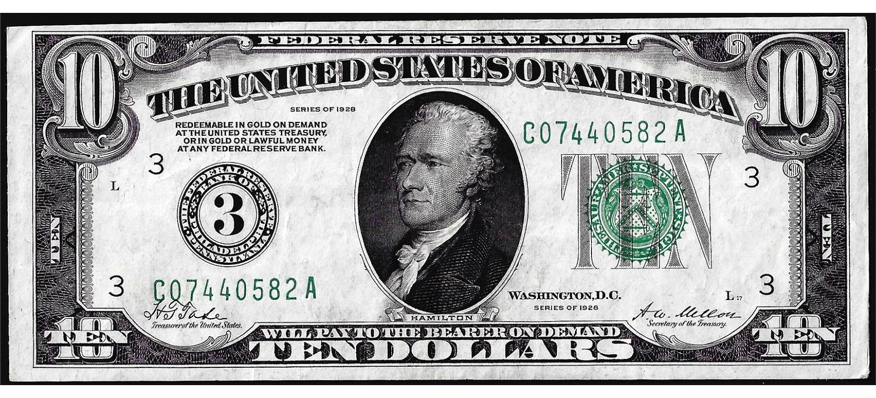 One 1928 $10 Federal Reserve Note Philadelphia.