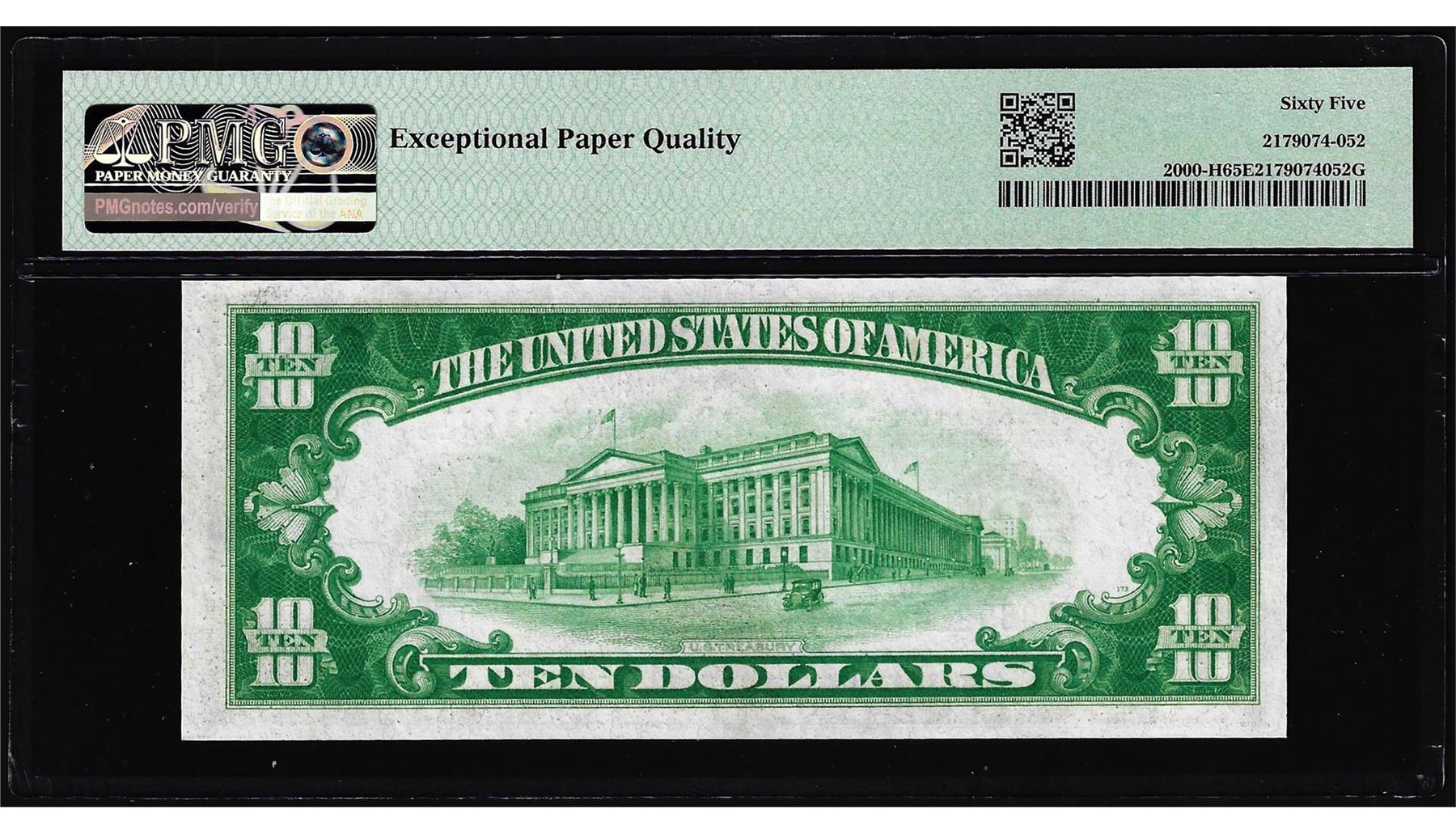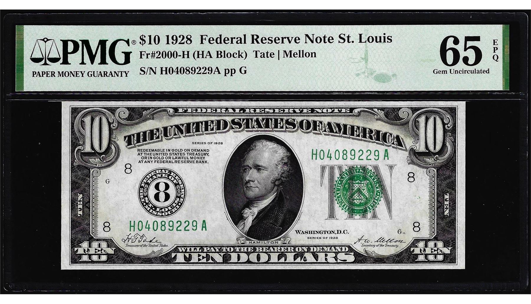 One 1928 $10 Federal Reserve Note St. Louis Fr.2000-H PMG Gem Uncirculated 65EPQ. PMG Certified.
