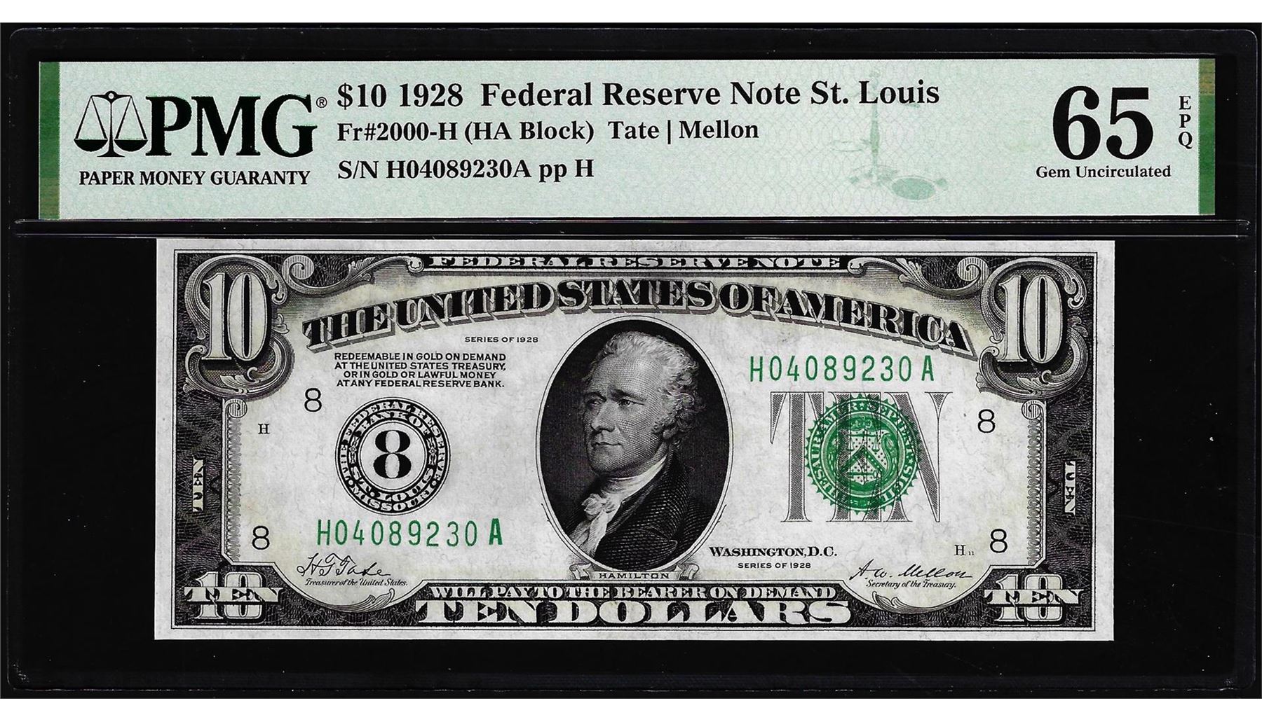 One 1928 $10 Federal Reserve Note St. Louis Fr.2000-H PMG Gem Uncirculated 65EPQ. PMG Certified.