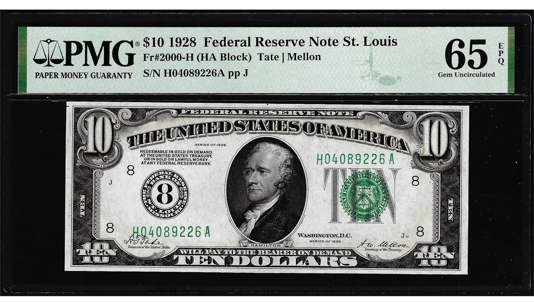 One 1928 $10 Federal Reserve Note St. Louis Fr.2000-H PMG Gem Uncirculated 65EPQ. PMG Certified.