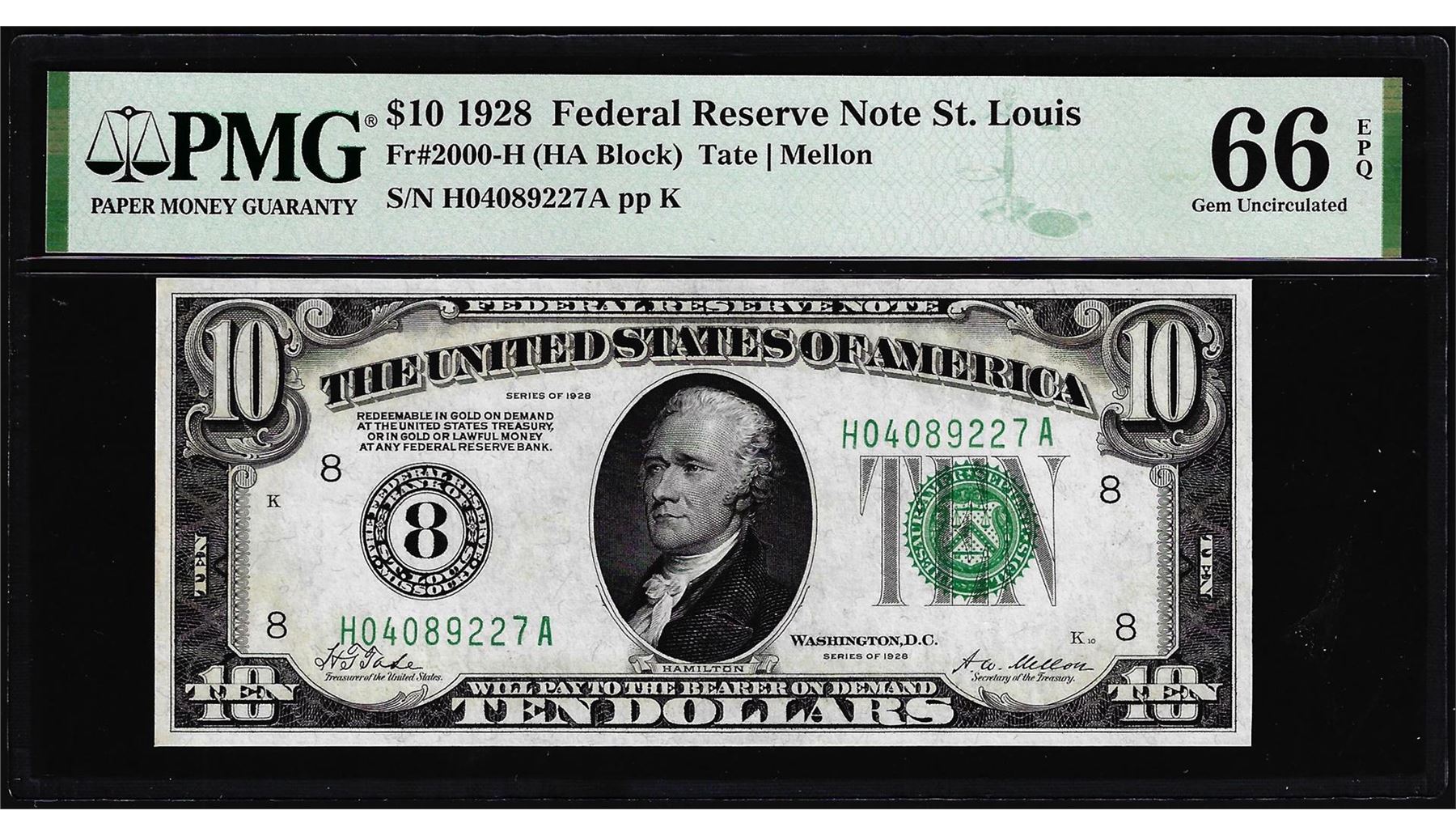 One 1928 $10 Federal Reserve Note St. Louis Fr.2000-H PMG Gem Uncirculated 66EPQ, this note is tied for the Finest Known in the PMG Population Report. PMG Certified.