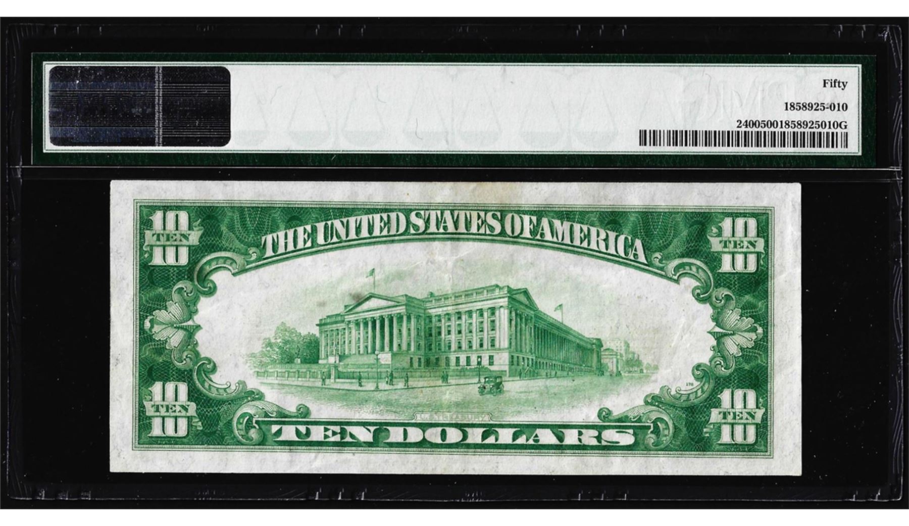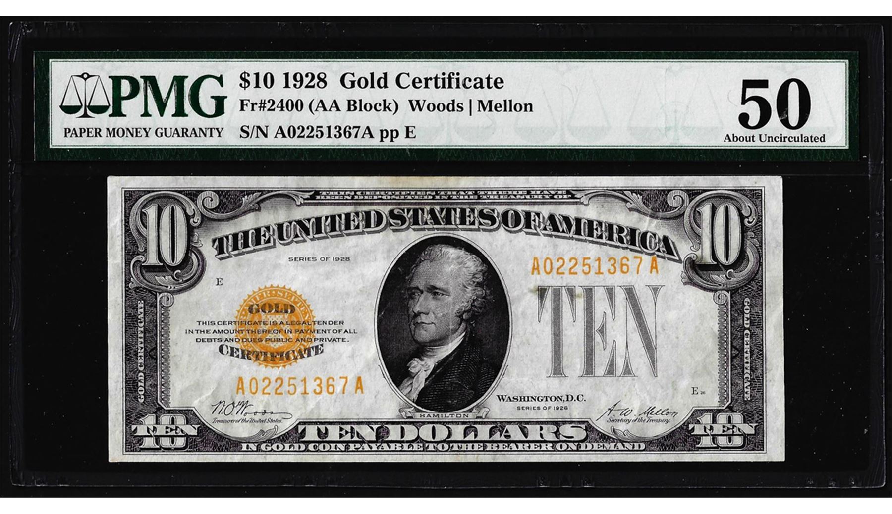 1928 $10 Gold Certificate Note Fr.2400 PMG About Uncirculated 50