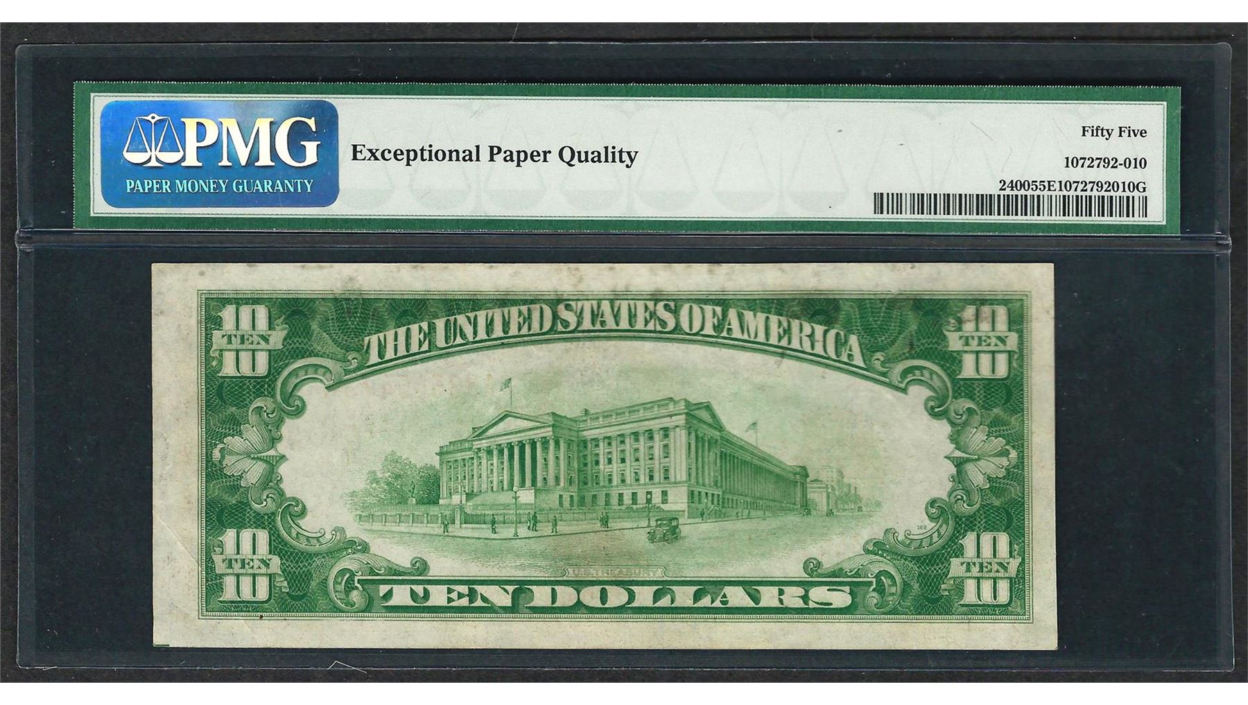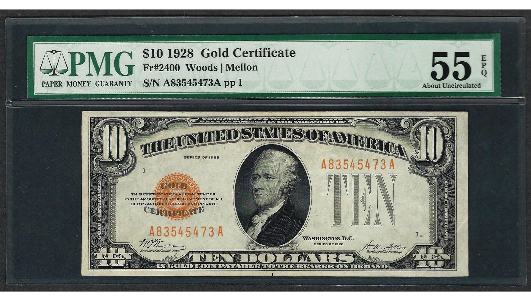 One 1928 $10 Gold Certificate Note Fr.2400 PMG About Uncirculated 55EPQ. PMG Certified.