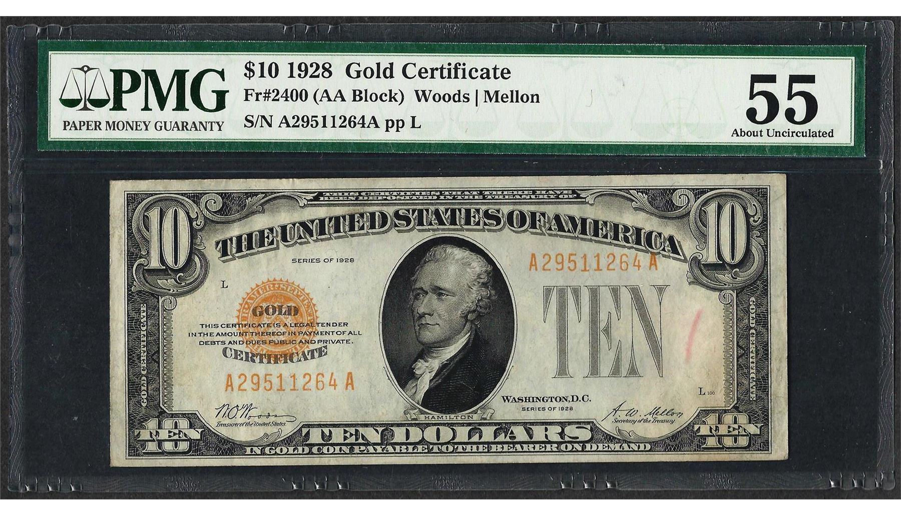 One 1928 $10 Gold Certificate Note Fr.2400 PMG About Uncirculated 55. PMG Certified.