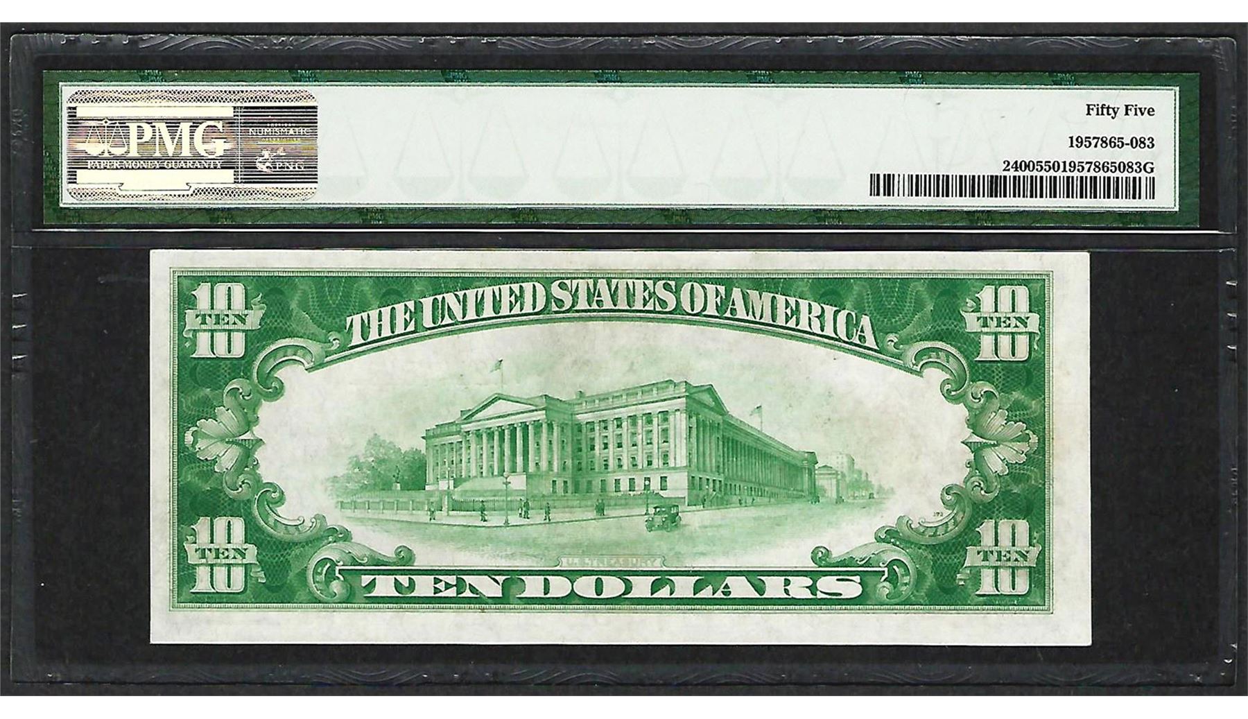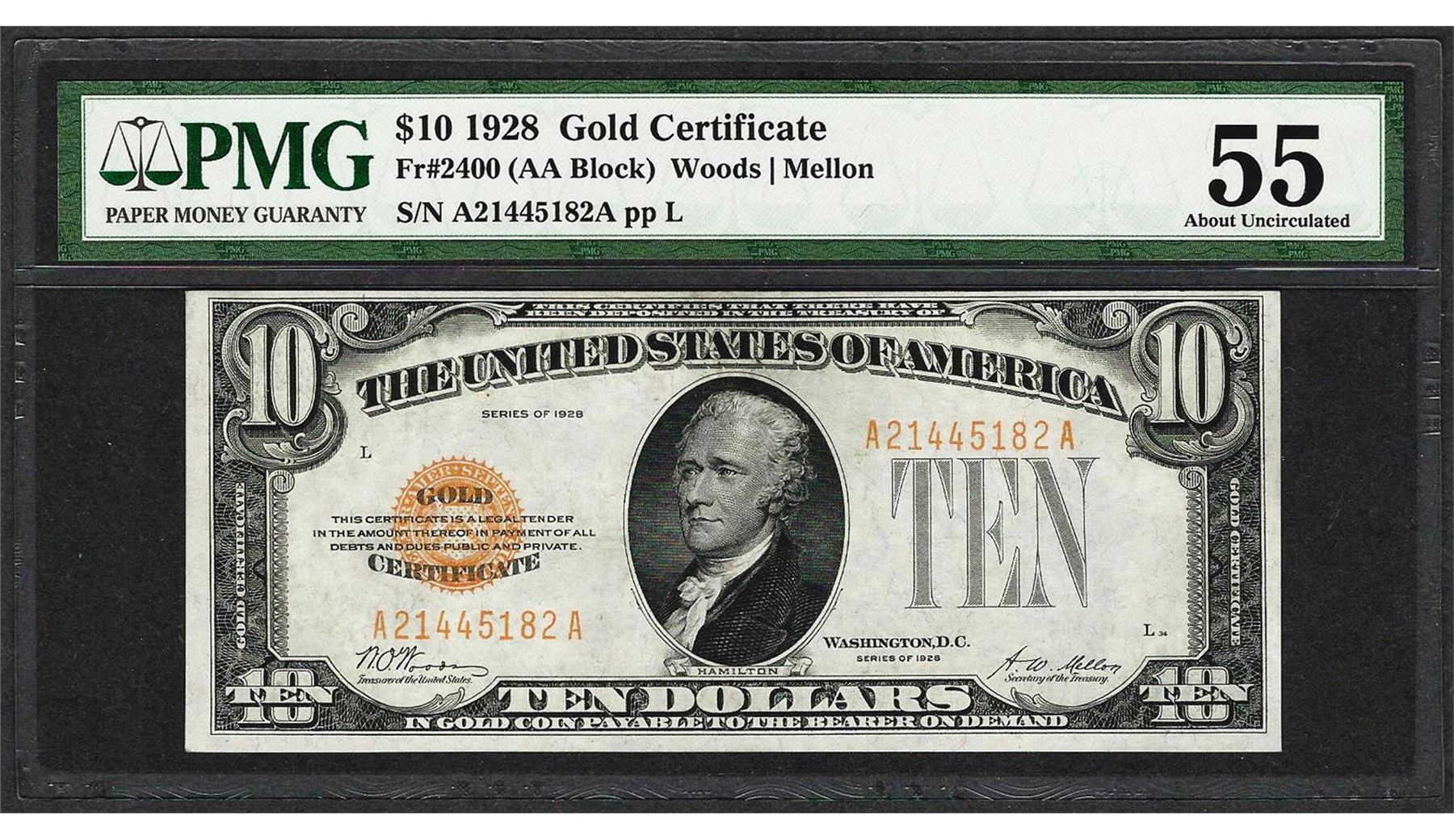 One 1928 $10 Gold Certificate Note Fr.2400 PMG About Uncirculated 55. PMG Certified.