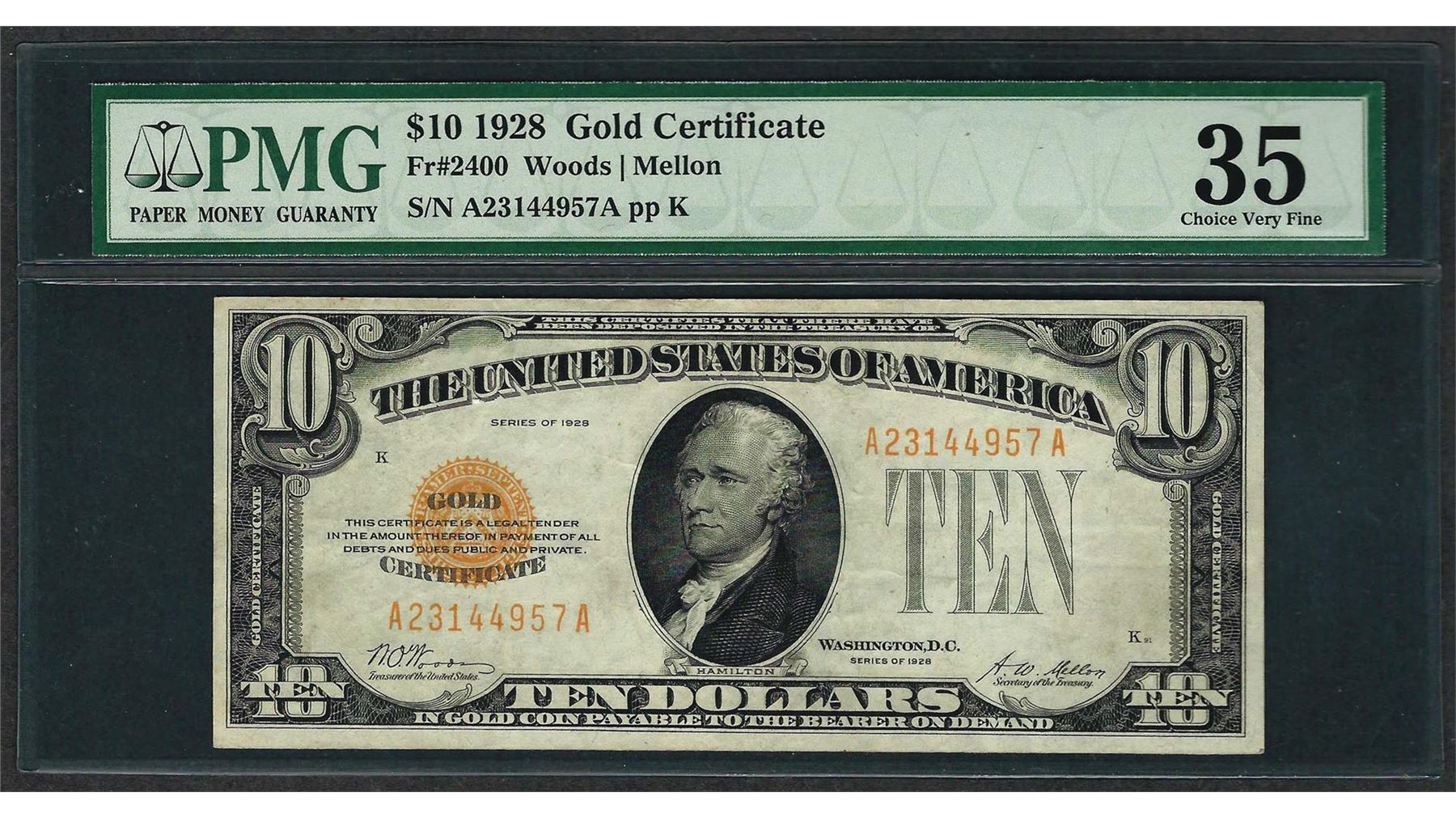 One 1928 $10 Gold Certificate Note Fr.2400 PMG Choice Very Fine 35. PMG Certified.