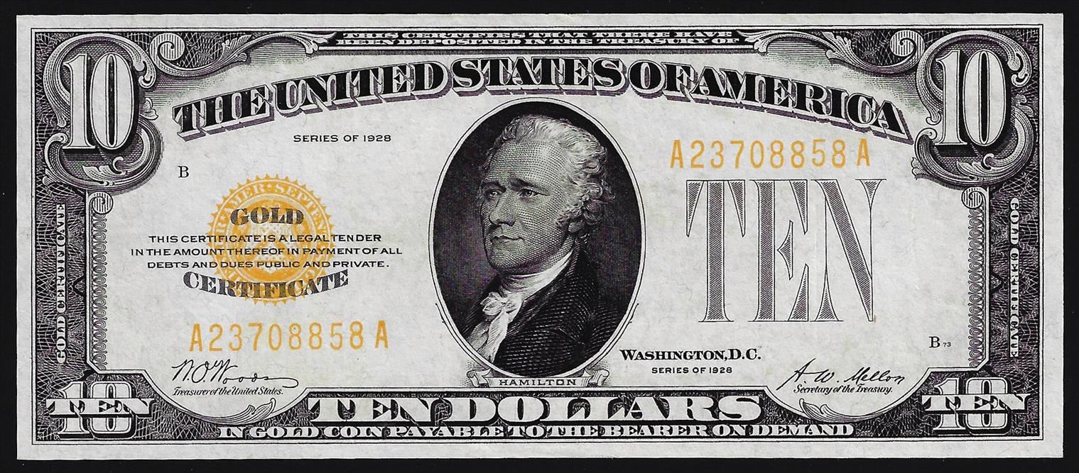 One 1928 $10 Gold Certificate Note.