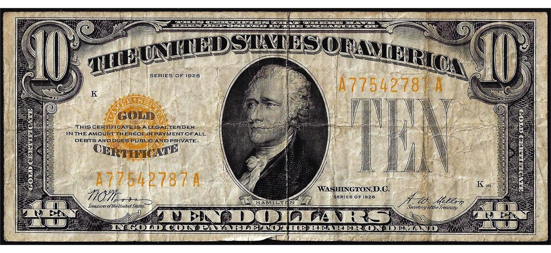 One 1928 $10 Gold Certificate Note.