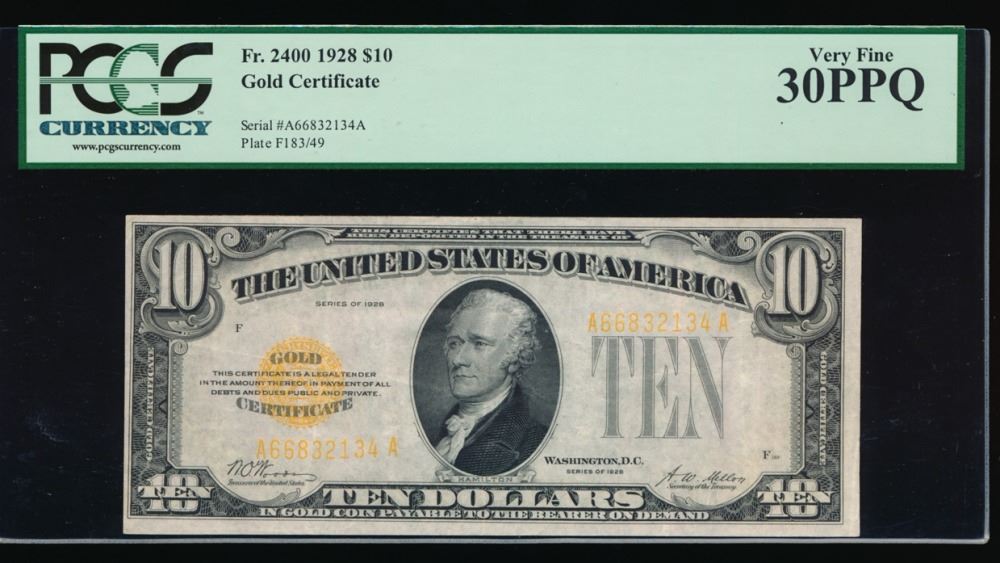 One 1928 $10 Gold Certificate PCGS 30PPQ.