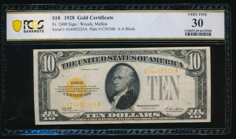 One 1928 $10 Gold Certificate PCGS 30.