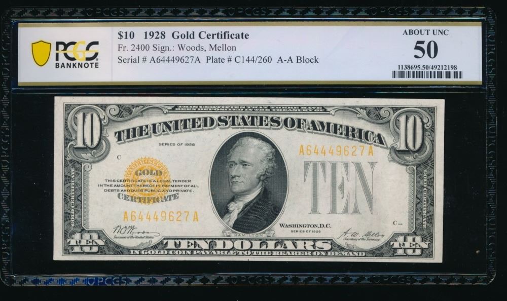 One 1928 $10 Gold Certificate PCGS 50.