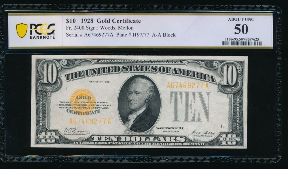 One 1928 $10 Gold Certificate PCGS 50.