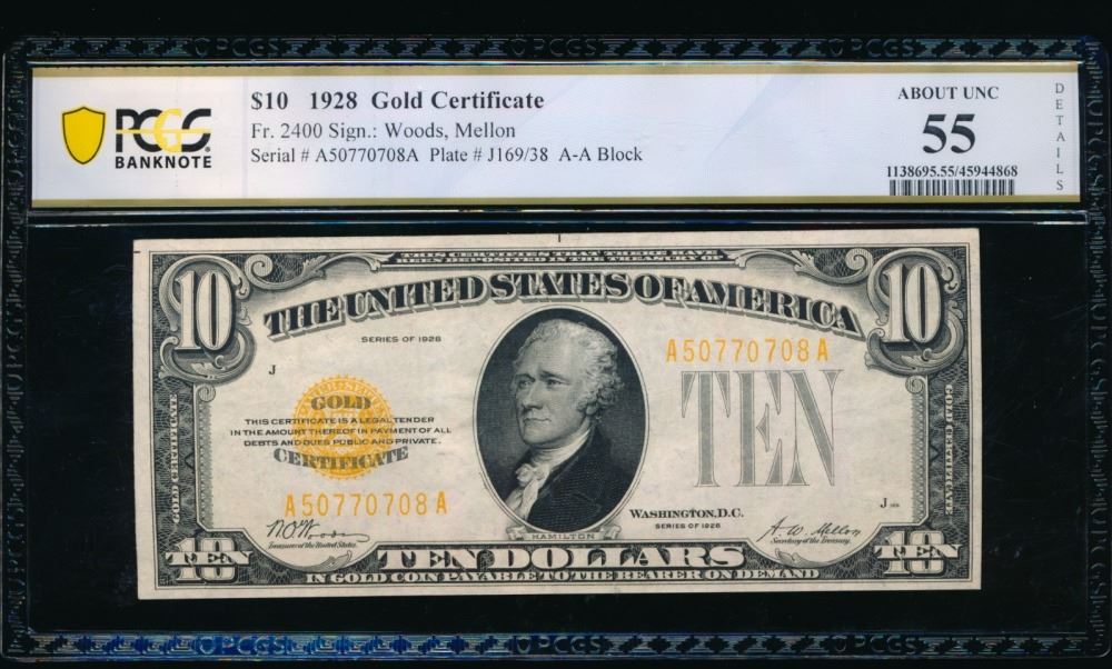 One 1928 $10 Gold Certificate PCGS 55.