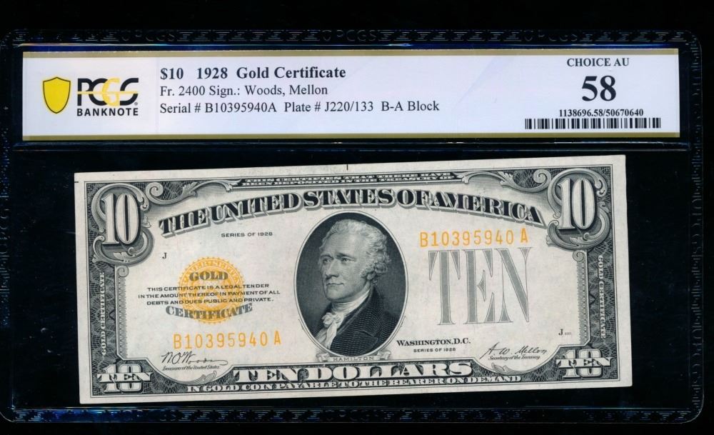 One 1928 $10 Gold Certificate PCGS 58.